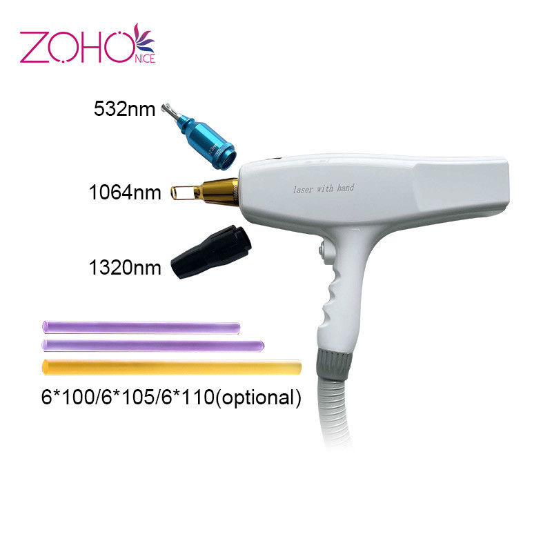 1064nmสําหรับการรักษาสีหมึกสีฟ้าหรือสีดําในผิวหนัง ปลายนี้สั้นกว่าเล็กน้อยและมีกระจกกลมภายใน
